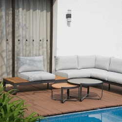 Das FLY Tischset mit hochwertigem Aluminium-Gestell in edlem Graphite-Finish vereint puristische Formsprache mit Funktionalität und Langlebigkeit. Die runden Tische verfügen über eine Tischplatte aus edlem Teakholz bzw. robuster Glaskeramik. Sie überzeugen durch Witterungsbeständigkeit und zeitlos moderne Ästhetik. Ob als Solitär oder im Duo als formschönes Ensemble neben der Lounge-Gruppe arrangiert – das Tischset lässt sich flexibel einsetzen und verleiht jedem Ambiente ein ganz persönliches Flair. Durch die Kombination aus klaren Linien, edlen Materialien und durchdachtem Design sind sie ein ästhetischer Blickfang – sowohl Indoor als auch Outdoor. Das FLY Tischset ist für 739 Euro (UVP) erhältlich.