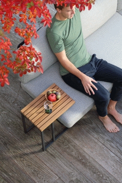 Ein echtes Multitalent auf Kufen – der rechteckige FLY Beistelltisch mit edlem Aluminium-Gestell in Graphite und hochwertiger Teakholz-Ablagefläche bringt nicht nur Stil, sondern auch außergewöhnliche Flexibilität in jeden Wohnbereich. Mit seinen kompakten Maßen von 45 x 31 x 49 (L x B x H) wird er schnell zum unverzichtbaren Wohnaccessoire. Das kufenartige Untergestell sorgt für Standfestigkeit und bietet die Möglichkeit, ihn als praktische Ablagefläche über eine Lounge-Gruppe oder Liege zu ziehen. Hochwertig, wetterfest, smart – der FLY Beistelltisch verbindet ästhetische Klarheit mit funktionaler Raffinesse. Er ist für 259 Euro (UVP) erhältlich.