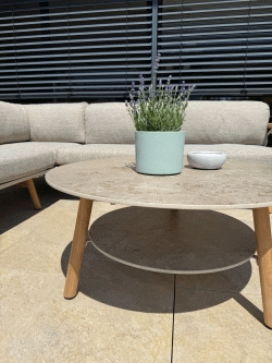 Der SOLENA Tisch fügt sich harmonisch in das Lounge-Ensemble ein und unterstreicht dessen einladenden, wohnlichen Charakter. Ob klassische Sitzgruppe aus einem 3-Sitzer und zwei Sesseln oder Eckvariante mit einem Sessel – die variabel zusammenstellbaren Möbelelemente werden durch den eleganten, 80 cm runden Tisch perfekt ergänzt. Seine zwei hochwertigen Keramiktischplatten im edlen Farbton trilium verleihen dem Design eine zeitlose Eleganz und setzt zugleich einen modernen Akzent. Besonders praktisch zeigt sich die kleinere, untere Tischplatte, die zusätzlichen Platz zur Ablage von Zeitschriften, Magazinen oder persönlichen Lieblingsstücken bietet.
